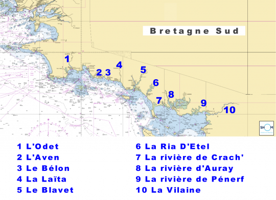 Alcuni fiumi e rii sono molto ampi e facili da raggiungere come il Vilaine, altri hanno una forte corrente e sono serpeggianti come il Laïta. Alcuni si aggirano per i parchi di ostriche, altri attraversano foreste o villaggi, tutti hanno la loro personalità.