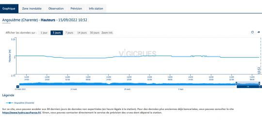 Piuttosto che affidarsi ciecamente alle parole sentenziose dei vecchietti con i tappi che guardano l'acqua salire infilandosi le mani in tasca, è preferibile fare riferimento alle misurazioni affidabili rese disponibili sul sito web di Vigicrues. È disponibile una mappa interattiva della Francia che consente di seguire i livelli e le curve di ciascun bacino fluviale. Questo mostra se la tendenza è al rialzo o al ribasso.