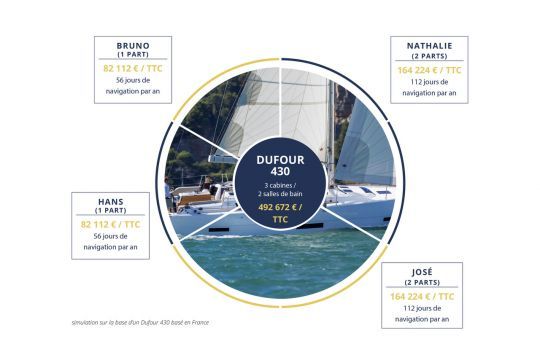 Ogni comproprietario ha a disposizione 14 giorni assicurati per ogni quota in alta stagione su date variabili nell'arco di 5,5 anni, mentre nel resto dell'anno può godersi la barca, fino a un limite totale di 56 giorni all'anno per una quota acquisita. Con l'acquisizione di 2 quote, pari al 34% della barca, si ottengono 112 giorni di navigazione all'anno, di cui 28 durante il periodo estivo