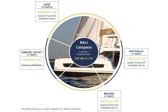 Nel caso di un Bali Catspace a St. Maarten nel 2022, il prezzo di una quota è di 119 414 EUR più 1 086 EUR al mese. Con un prezzo di rivendita alla fine dei 66 mesi stimato in 340.600 euro, ogni azione recupera 65.135 euro. Dream Yacht Charter stima il reddito potenziale a 120.276 euro per azione. Il costo finale per la durata del programma è di 6.765 euro, pari al prezzo di una singola settimana di charter in bassa stagione.