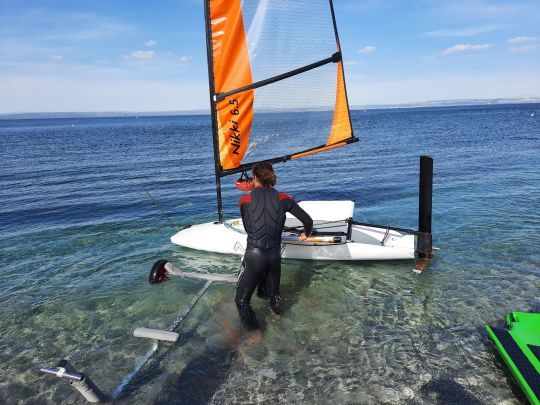 È facile da assemblare con lo scafo posato in piano sul suo carrello, non c'è bisogno di stenderlo. Il Nikki è disponibile con tre superfici veliche, 4,3 m2, 5,5 m2, 6,5m2, da scegliere in base alle condizioni e al peso del timoniere.