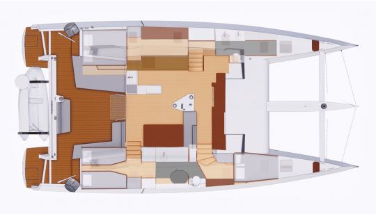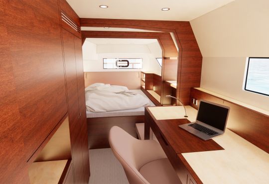 La disposizione sottocoperta può essere adattata alle esigenze del cliente. La prima unità offre un layout classico, con uno scafo di babordo dedicato all'armatore con un'area di lavoro e un attraente bagno, mentre lo scafo di tribordo offre due cabine, di cui una con letti singoli.