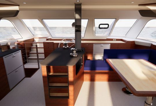 Oltre la plancia di comando, il tetto ospita le consuete caratteristiche dei catamarani, con un ampio salone a dritta e una cucina a sinistra. A poppa, il pozzetto, protetto da un tettuccio, offre una bella panca a L e un'ampia zona prendisole.
