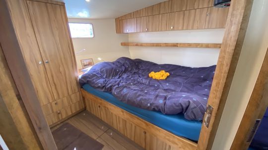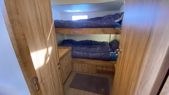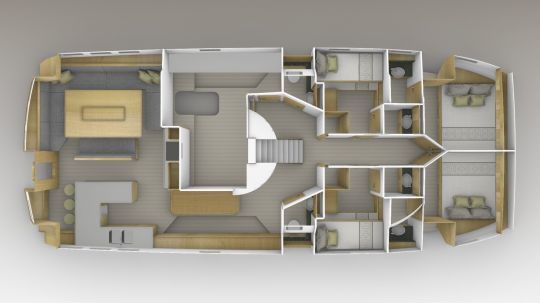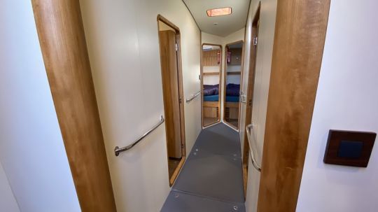 Sotto questo enorme ponte, si trovano 4 cabine doppie e 4 bagni. Tutti questi servizi sono distribuiti simmetricamente a prua della passerella. Spostandosi a poppa, si passa ai motori. Si tratta di una motorizzazione elettrica con 2 x 45 kW sostenuti da 2 generatori da 50 kW ciascuno. Grazie al grande pacco batterie al litio, la barca è completamente autosufficiente.