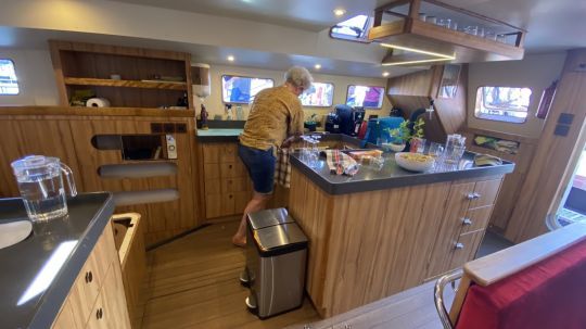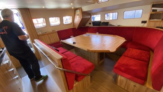 Il pezzo forte è il salone situato nella parte posteriore della barca, con un'enorme cucina. Questo salone si apre direttamente sulla gonna di poppa, con una vera e propria porta abbastanza grande da non doversi chinare.