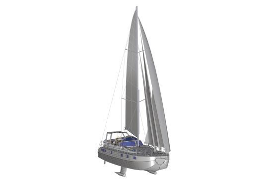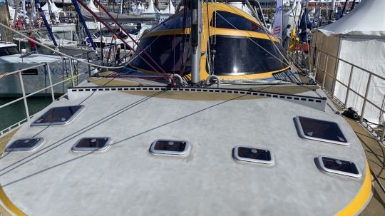 Questo yacht interamente in alluminio non nasconde il suo aspetto robusto e non lucido. Non c'è spazio per i fronzoli. Le panche del pozzetto sono semplici doghe, mentre il resto è rivestito di antiscivolo in stile industriale. Passeggiare sul ponte è un'esperienza improbabile, tanto è ampio. L'enorme ponte di prua dà accesso al gavone dell'ancora e al gavone delle vele.