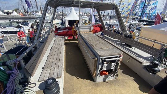 Mirabelle 16, che prende il nome dal frutto emblematico della Lorena, è uno yacht in alluminio con prua a prua. È difficile descriverne l'aspetto dal pontile. Questo yacht di quasi 16 metri è largo 6 metri dall'inizio alla fine. Sembra più una chiatta che un cruiser racer! Sotto la linea di galleggiamento, ci sono 2 chiglie che portano il pescaggio a 1,80 m e 2 timoni collegati a una timoneria idraulica. Con un peso di 23 tonnellate, non si può dire che il design dello scow sia molto rilevante... In effetti, questo tipo di scafo richiede barche molto leggere per essere efficace.