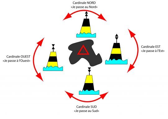 Per segnalare le aree a rischio si utilizzano quattro boe cardinali. Intorno a uno scoglio o a un'altra barriera corallina, vengono posizionate ai 4 punti cardinali: Nord, Sud, Est e Ovest. Quindi un cardinale Nord sarà posizionato a Nord del pericolo. È quindi necessario passare a nord della boa per evitare il pericolo.