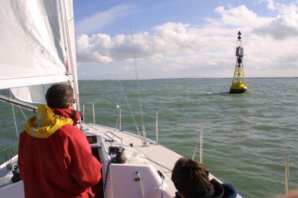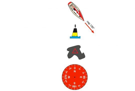 Nella nostra situazione, la foto mostra chiaramente che si tratta di un cardinale nord. I due coni sono rivolti verso l'alto e la boa è nera in alto e gialla in basso. Quindi lo yacht deve trovarsi a nord della boa per essere fuori dalla zona di pericolo. Questo è il caso nostro, che ci stiamo dirigendo verso sud-est con una rotta di 130°, con la boa sulla nostra prua di dritta e 3/4, quindi siamo esattamente nel posto giusto, come mostra il diagramma qui sotto!