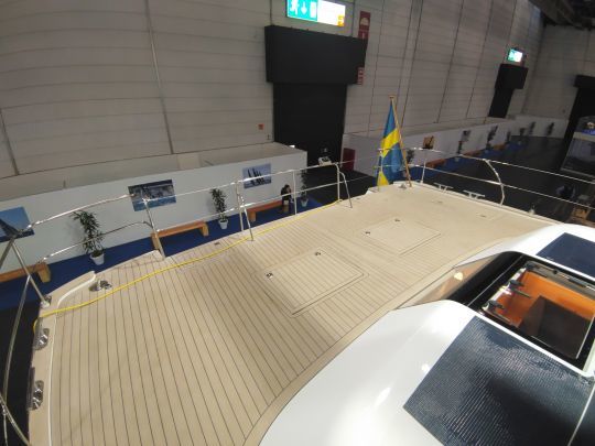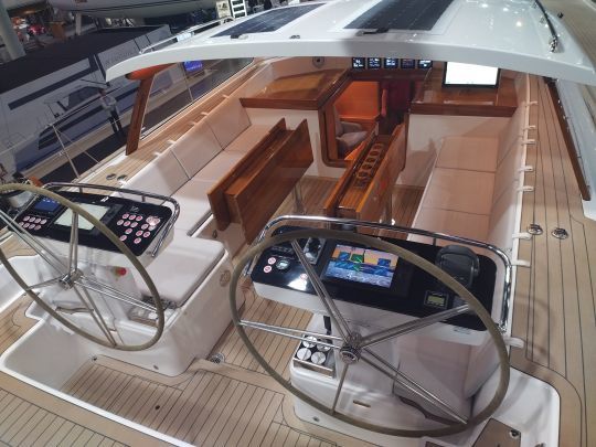 Davanti, due bei tavoli verniciati accolgono l'equipaggio, protetti dall'inconfondibile parabrezza Hallberg Rassy. Nella versione che abbiamo visitato, sono sormontati da un hard-top rigido, purtroppo basso. Il compromesso estetico di mantenere le linee basse va a scapito del comfort.