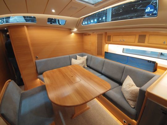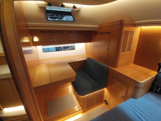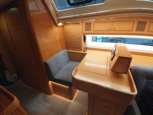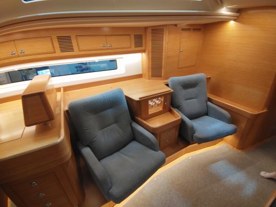 I gradini che scendono dall'ampio companionway conducono al salone, dove si può riconoscere il layout dell'Hallberg Rassy e la raffinatezza delle vernici e il calore del legno utilizzato dal produttore svedese. A dritta si trova un comodo salone per i pasti, mentre a sinistra due generose poltrone circondano un armadietto per le bevande che invita a sorseggiare un drink al caldo quando il clima esterno è troppo rigido.
