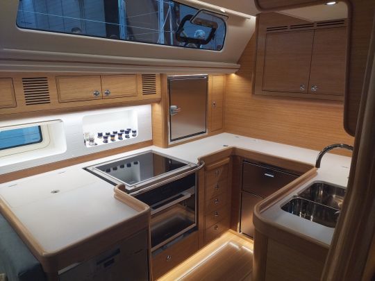 A dritta a poppa, la cucina a U permette di preparare i pasti à la gite senza problemi di stivaggio. A babordo, un vero e proprio tavolo da carteggio si affaccia sulla strada, mentre la passerella dà accesso alla cabina di poppa e alla sala macchine situata sotto il pozzetto, con molto spazio per entrare completamente e mantenere i numerosi comfort.