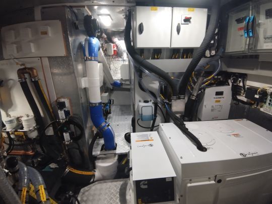 A poppa del salone si accede alla vasta cabina armatoriale. Oltre a un ampio bagno con doccia separata, la versione visitata dispone di un vero e proprio spogliatoio e di una zona ufficio. È inoltre possibile disporre di cuccette aggiuntive.