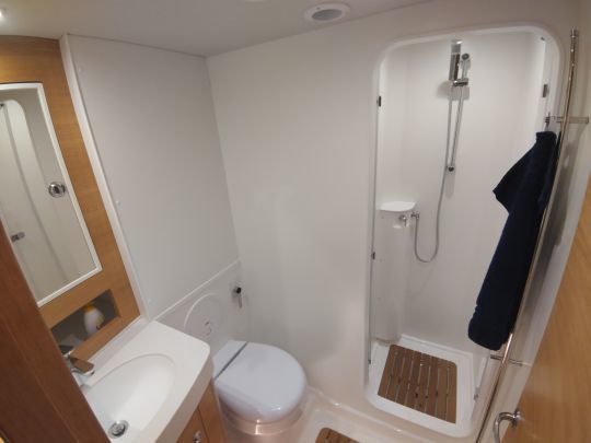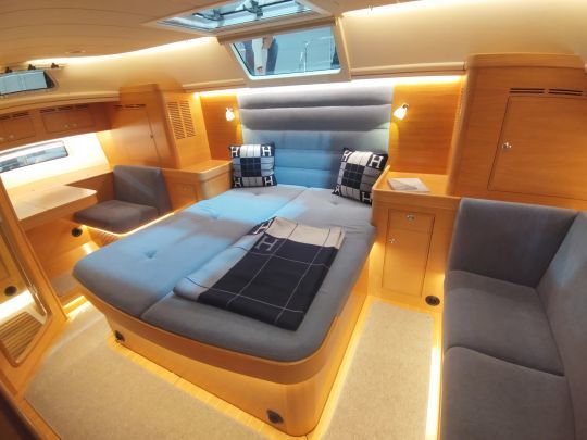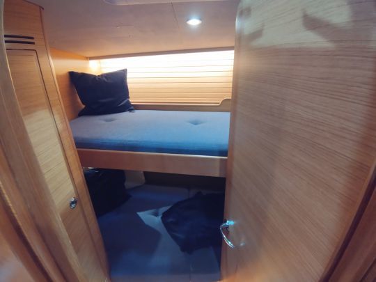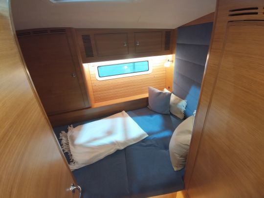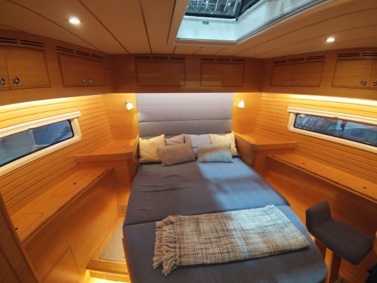 A prua dell'albero si trovano una cabina con letti a castello a sinistra, una cabina doppia a dritta e una cabina doppia più confortevole con letto a isola nel gavone di prua. Due bagni separano queste cabine.