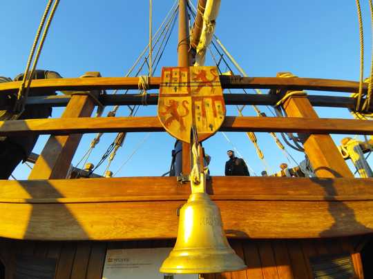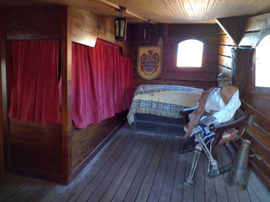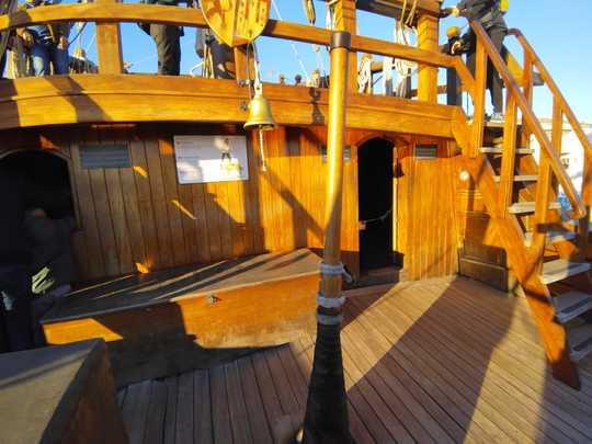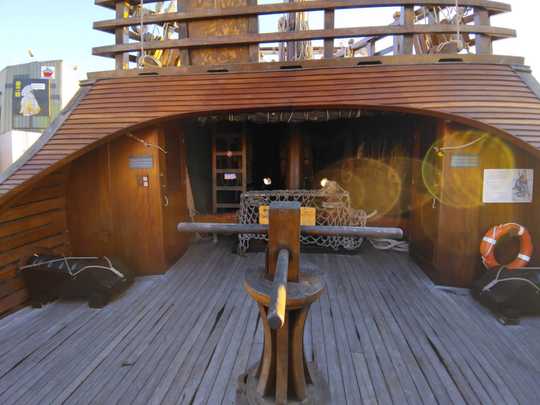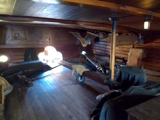 Sotto il castello di prua si trova un'area coperta che ospitava corde di ricambio, vele e attrezzi. C'è anche il grillo a pale, che aziona l'enorme barra del timone da 2 tonnellate.