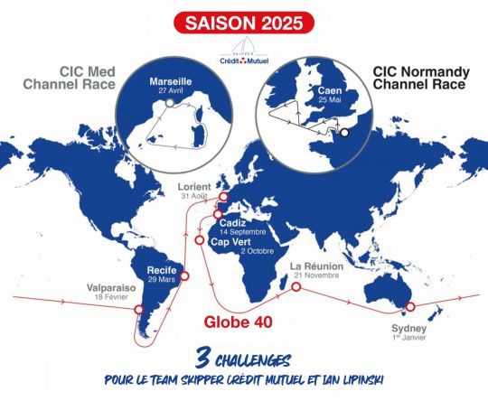 Uno dei momenti salienti dell'anno sarà senza dubbio la Globe 40, il giro del mondo in doppio con scalo. Il prologo a Lorient il 31 agosto 2025 segnerà l'inizio di questo viaggio epico, prima della partenza ufficiale da Cadice il 14 settembre. Sono previste sette tappe, tra cui Mindelo a Capo Verde, l'Isola della Riunione, Sydney e Recife. Questo percorso impegnativo è stato progettato per mettere alla prova non solo le prestazioni delle imbarcazioni, ma anche la resistenza degli equipaggi nel corso di tappe lunghe e varie. Questa sarà la prima circumnavigazione del globo per lo skipper Ian Lipinski.