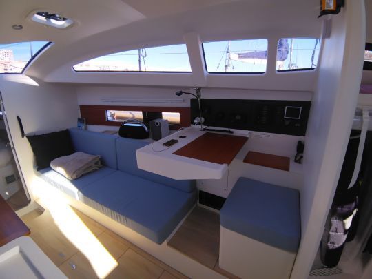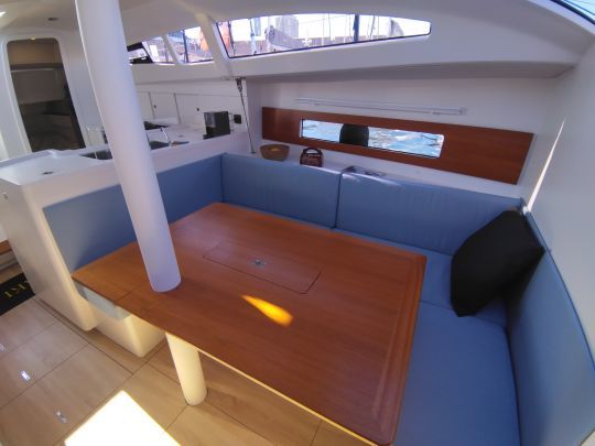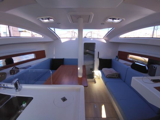 Sottocoperta, l'RM 1080 ha un layout elegante e funzionale, progettato in compensato verniciato per una finitura ordinata e personalizzabile. L'illuminazione naturale è uno dei punti di forza del modello, con grandi oblò laterali e una vista panoramica che offre una visibilità senza ostacoli a prua. Ciò significa che è possibile tenere d'occhio il ponte di prua dall'interno, mentre il salone è immerso nella luce naturale.