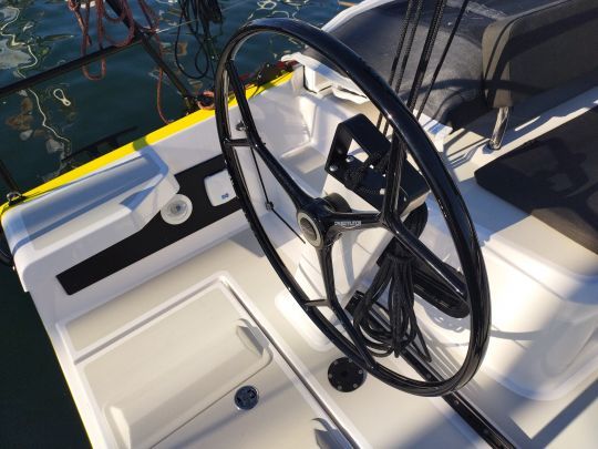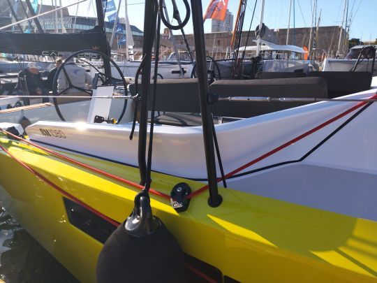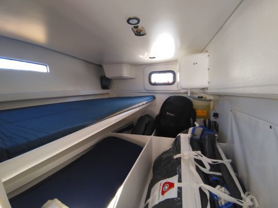 Tra i dettagli pratici, il gavone dell'ancora di grande capacità consente di riporre una grande quantità di catena senza il rischio di incastrare l'ancora. I pannelli scorrevoli verticalmente della passerella offrono un maggiore comfort durante la navigazione e l'ancoraggio.