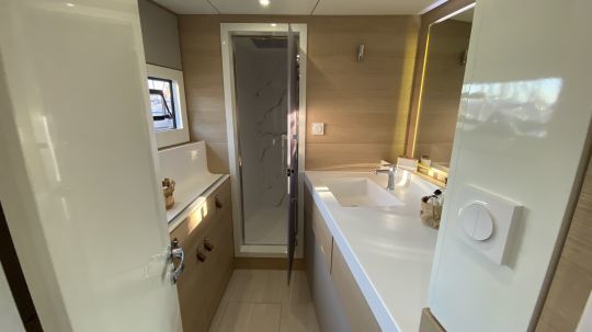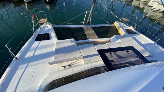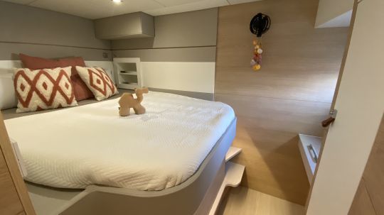 L'Aventura 45 si distingue per le sue sistemazioni. Il catamarano può essere configurato con tre, quattro, cinque o sei cabine, con un massimo di quattro bagni. Le passerelle nel pozzetto consentono l'accesso diretto ad alcune delle cabine di poppa, in particolare nelle versioni armatoriali. Questa flessibilità è rara in questa categoria. Le cuccette ad angolo retto rispetto alla linea di galleggiamento ottimizzano lo spazio senza ostacolare la circolazione.