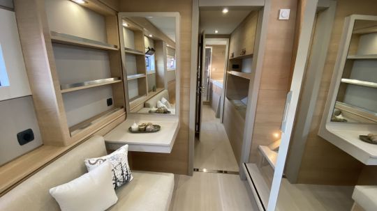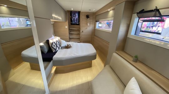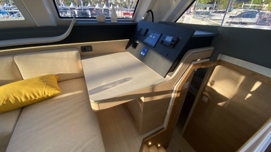 Abbandonando l'albero davanti alla tuga a favore di un albero appoggiato sulla tuga e sostenuto nel salone da una spugna, i volumi sono stati ridistribuiti. Il salone centrale ospita una cucina a L, una zona di navigazione dotata di centralina Garmin EmpirBus e un'ampia dinette. L'intera area rimane fluida e luminosa, con una vista libera sull'esterno grazie alle paratie laterali abbassate e al design delle finestre.
