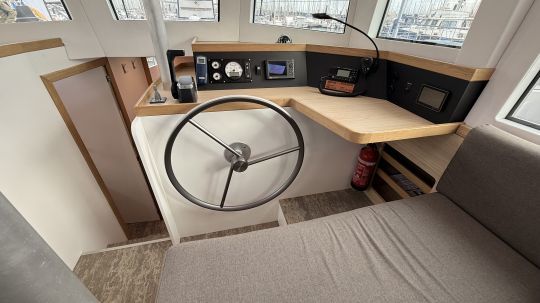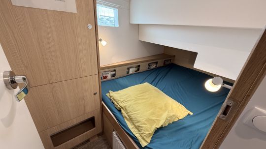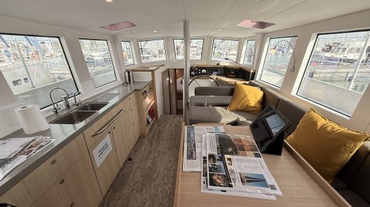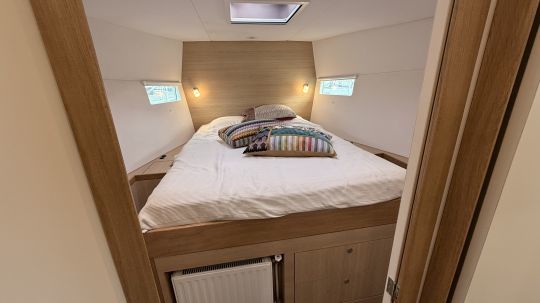 La zona giorno è luminosa e flessibile, con una cucina completamente attrezzata (tre fuochi a gas, frigorifero con cassetti, doppio lavello, microonde con inverter, lavatrice da 3 kg). Il tavolo pieghevole offre ulteriore spazio per dormire. La zona notte comprende due cabine doppie, di cui una a prua con un ampio spazio di stivaggio. Un bagno con doccia separata completa la disposizione. Una caratteristica divertente è il pianoforte sul retro di questo salone molto accogliente.