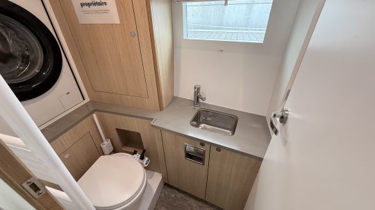 Ogni Isméria 45 può essere personalizzato, in particolare per quanto riguarda gli interni in legno. Sebbene il layout sia modulare, lo yacht che abbiamo visitato disponeva di 2 cabine doppie e di un bellissimo bagno con doccia, che ospita anche la lavatrice.