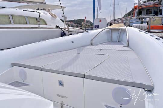 Il ponte di prua ospita un ampio solarium di 2,54 x 2,20 m, che poggia su un gavone a scomparti. Il pavimento sdoppiato facilita l'apertura dei boccaporti e dà accesso a una stiva profonda, adatta a riporre sia l'attrezzatura da ormeggio che quella di bordo.