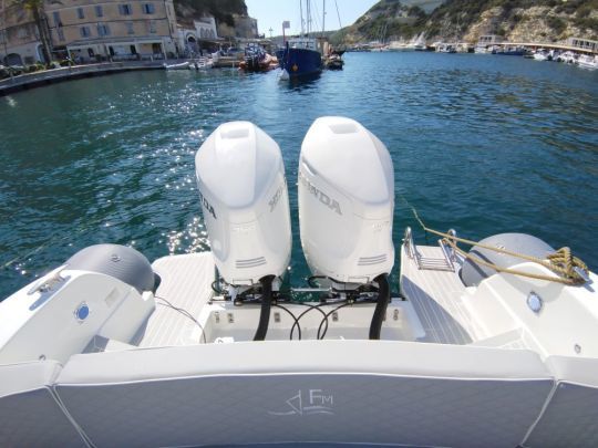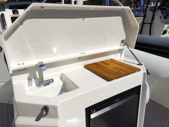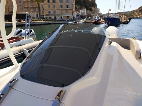 Questo layout di coperta conferma la volontà del cantiere corso di offrire un RIB principalmente funzionale, in grado di affrontare una serie di ancoraggi o traversate veloci senza rinunciare al comfort a bordo.