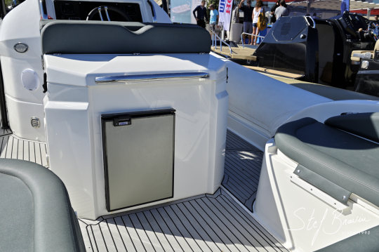 Sotto la panca, ampi gavoni ospitano le attrezzature di sicurezza e gli oggetti di bordo. L'accesso alla stiva tecnica avviene tramite un portello centrale che si apre sulle batterie e sul serbatoio dell'acqua.