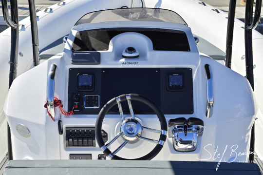 All'esterno, la plancia presenta due display âeuro di medie dimensioni, la strumentazione Honda per i dati del motore e un plotter GPS Simrad per la navigazione âeuro, completati da uno stereo Fusion, prese USB e una bussola centrata nella linea di vista.