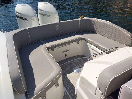 Il pozzetto di poppa è il punto focale della facilità d'uso dell'imbarcazione. La panca a U incornicia un tavolo rimovibile e può essere trasformata in un solarium di poppa di 2,00 x 1,32 metri. La parte posteriore del pontile incorpora una cucina dotata di un piccolo lavello e di un frigorifero, che consente di trascorrere intere giornate in mare.