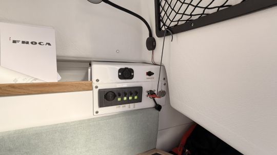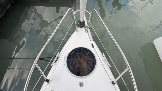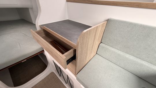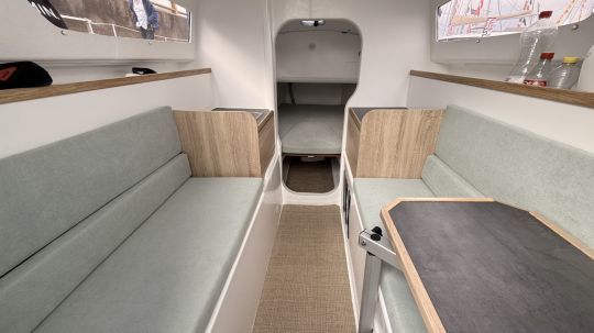 Il volume interno del 26.5 rappresenta un significativo passo avanti nella gamma. La cabina di prua, separata da una tela, dispone di una cuccetta doppia di 1,40 m in testa, che si restringe a 1 m ai piedi. Il salone, con un'altezza libera di 1,80 m, comprende due panche laterali che possono essere trasformate in cuccette larghe circa 60 cm (le cuccette possono essere estese nel corridoio durante la notte). L'equipaggiamento interno rimane essenziale: un lavandino, un piccolo fornello, acqua dolce e una zona toilette sotto la cuccetta anteriore. Questa configurazione è chiaramente destinata a viaggi di pochi giorni in acque costiere, pur mantenendo un minimo di comfort per una famiglia di quattro persone.