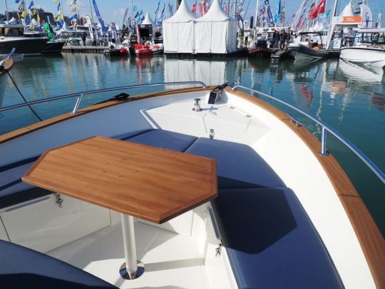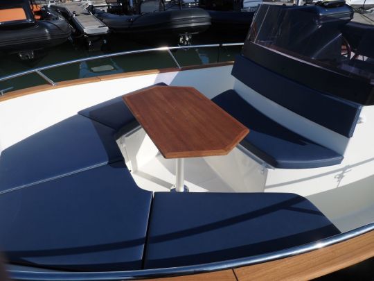 Esteticamente, il 23 Origine riprende i codici visivi del marchio: scafo blu scuro, trincarini in legno (iroko) e tappezzeria semplice in tessuto idrorepellente. L'insieme è coerente, senza essere eccessivo. A prua c'è un salone con tavolo amovibile, una zona centrale con due sedili regolabili per il timone e una panca tripla a poppa.