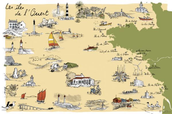 Tornata in Bretagna, Margot inizia una nuova collezione: una mappa illustrata per ogni isola costiera che ha amato. Si tratta di Groix, Belle-Îles-en-Mer, Houat e H?dic, oltre a Sein, Molène e Ouessant. Ogni mappa è un'esplorazione a inchiostro e acqua, a metà tra un diario di navigazione e un'interpretazione artistica.