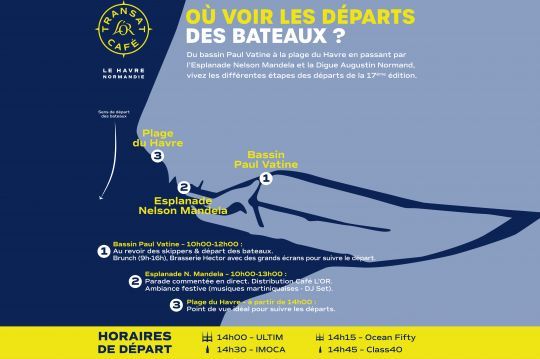 Per chi non potrà essere a Le Havre, la gara sarà trasmessa in diretta televisiva e online. Francia 3 e france.tv trasmetterà la partenza tra le 10.00 e le 15.30, accompagnato da una serie di esperti in onda. Una mappa interattiva permetterà di seguire le posizioni ogni cinque minuti fino alle 15.30, accessibile sul sito ufficiale della gara. Le prime classifiche appariranno alle 16.00.