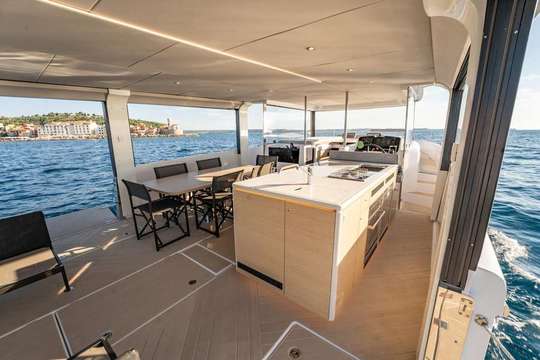 La cucina centrale è il cuore della barca, mentre il salone panoramico, inondato di luce naturale, diventa il luogo di ritrovo privilegiato. Le cabine offrono un vero comfort alberghiero e l'insonorizzazione garantisce un riposo tranquillo. Ogni angolo dell'imbarcazione è stato progettato per ampliare l'utilizzo senza rinunciare al comfort.