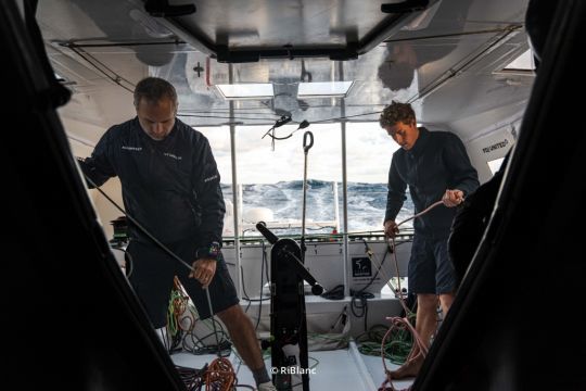Il fatto che un Imoca abbia i foil non significa che sia necessariamente perfetto. Sul loro IMOCA a prua, Andreas rimpiange l'assenza di alcune attrezzature pratiche. Fabrice, dal canto suo, punta molto sulla raccolta di dati ambientali a bordo. CO2, microplastiche, DNA marino: la barca dispone di una mini-stazione scientifica a bordo per comprendere meglio gli oceani che attraversa.