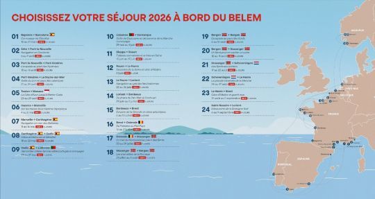 Nel 2026, la Belem intraprenderà un ampio tour di porti francesi ed europei. Da Le Havre a Sète, passando per Brest, Marsiglia, Barcellona, Lisbona, Amsterdam e Oslo, gli scali saranno numerosi. La nave visiterà le coste del Mediterraneo, dell'Atlantico, del Canale della Manica e del Mare del Nord.