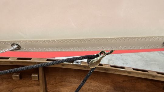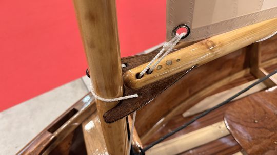 " Questo gommone era in condizioni abbastanza buone per la sua età. Tuttavia, abbiamo modificato il fondo e lo specchio di poppa. Per renderlo più solido e a tenuta stagna, abbiamo applicato uno strato di laminato alla parte inferiore, che corre leggermente lungo i lati. Infine, abbiamo carteggiato tutto per dare una bella verniciatura, ma tutto è originale, anche l'opaco! Abbiamo anche riutilizzato gli accessori. Una nuova vela è stata tagliata dai velieri Tarot, che hanno utilizzato l'esercizio per formare un apprendista nella costruzione di vele tradizionali. "