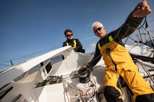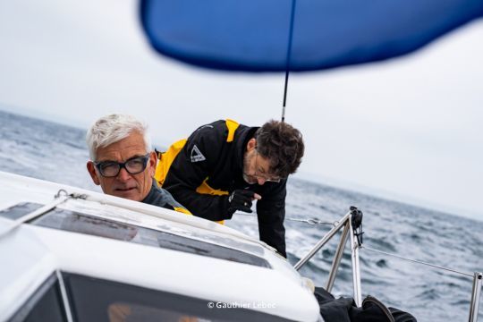 A poche ore dalla partenza, Vincent Riou ci accoglie a bordo del suo Class40, mentre si prepara alle condizioni meteorologiche. Niente discorsi di circostanza, ma uno scambio spontaneo, franco e a volte irritante, come piace a lui. Il velista del Finistère, vincitore del Vendée Globe nel 2004, si lancia in un'avventura un po' diversa, basata sulla condivisione e sulla trasmissione. Il suo compagno di squadra? Un dilettante illuminato che, fino a due anni fa, conosceva le regate oceaniche solo grazie alla loro immagine televisiva.