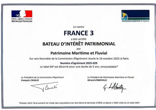La barca a vela FRANCE 3 ha appena ottenuto il marchio "FRANCE 3" Barca di interesse storico "Il marchio è stato assegnato dal Patrimoine Maritime et Fluvial, un organismo presieduto da Gérard d'Aboville. Il marchio viene assegnato alle navi di interesse storico, tecnico o architettonico per il patrimonio marittimo francese.