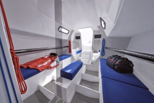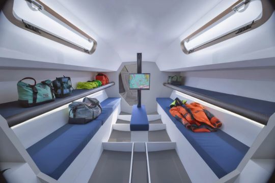 La disposizione degli interni è incentrata sulla funzionalità. 4 cuccette fisse offrono riposo all'equipaggio, integrate da sedute strutturali intorno al gradino dell'albero e alla chiglia. La stazione di navigazione, la possibilità di un modulo tavolo e la presenza di una zona cucina compatta soddisfano le esigenze delle regate di più giorni.
