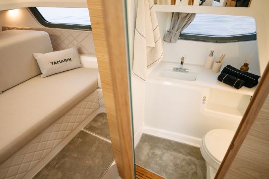 L'elenco dei servizi possibili comprende una toilette con serbatoio per le acque nere, doccia e acqua calda. Anche in questo caso, la scelta è lasciata all'armatore. Questo grado di modularità piacerà sia ai diportisti che ai noleggiatori, anche se ogni opzione aggiunge complessità alle reti di bordo.