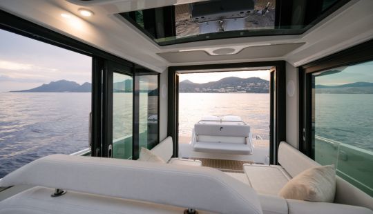 L'Aura Cabin è stato progettato per passare da un uso utilitario alle latitudini settentrionali a una navigazione più edonistica nei climi più caldi. Nel Mare del Nord o negli arcipelaghi scandinavi, la timoneria chiusa, le porte laterali scorrevoli e il portellone posteriore pieghevole formano un volume protettivo. Il traffico è protetto, con una visibilità panoramica a 360 gradi.