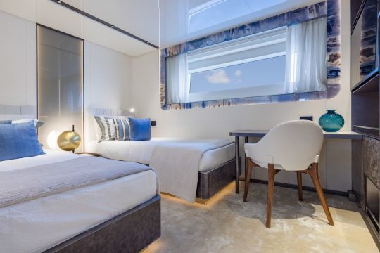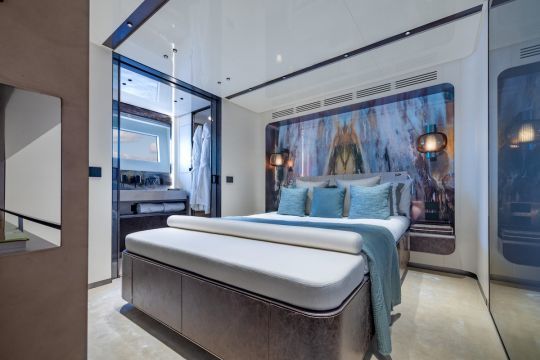 Le cabine degli ospiti, situate sul ponte inferiore, riprendono i codici estetici della suite padronale con una palette più morbida. Marmi chiari, contrasti tattili e illuminazione indiretta. Anche in questo caso, l'obiettivo rimane lo stesso: offrire un comfort immediato senza esagerare con gli effetti decorativi.