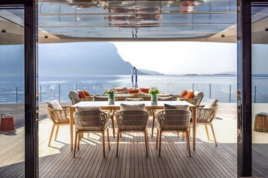 Spostandosi a poppa, si trovano una zona pranzo riparata, un salone centrale con piscina e balconi retrattili, e poi una piattaforma multifunzione dotata di un sistema di trasformazione. Quest'ultima si trova a soli cinquanta centimetri sopra la linea di galleggiamento, un dettaglio che cambia l'accesso al mare, soprattutto quando si è ancorati.