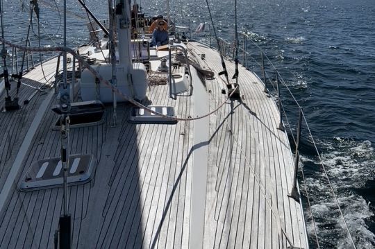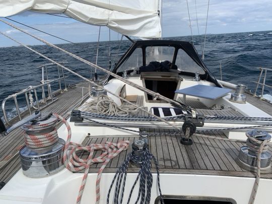 Il ponte in teak, rifatto nel 2013, offre una circolazione chiara e sicura. I due pozzetti offrono una buona protezione all'equipaggio e riducono l'affaticamento durante i lunghi turni di guardia. L'albero in alluminio con tre crocette, riverniciato nel 2021, può portare sottovento un'ampia superficie velica fino a 330 m², mantenendo il carico ben distribuito. Lo yacht è dotato di un genoa, ma può essere armato anche come cutter con uno yankee e una tranquette.