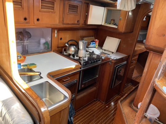 All'interno, Tayya offre quattro cabine per otto persone, una configurazione coerente per un programma di crociere oceaniche con equipaggio. L'arredamento è in teak, in un bel colore chiaro. Il salone può ospitare da sei a otto persone, senza alcun senso di confinamento, e la cucina rimane funzionale in mare.