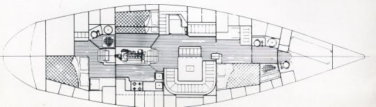 Il Nauta 54 appartiene a questa generazione di eleganti imbarcazioni da crociera oceanica, progettate per navigare a lungo e a pieno carico. Con un dislocamento di 17,60 tonnellate e un pescaggio di 2,80 metri, le proporzioni del Tayya enfatizzano la rigidità sotto vela e la stabilità in navigazione. Lo scafo spesso, in linea con gli standard della fine degli anni '80, accetta le sollecitazioni senza reazioni improvvise.