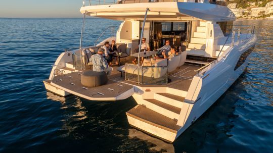 Il layout esterno è stato rivisto, con un pozzetto posteriore offerto in due versioni: una configurazione modulare nota come Alfresco, o un layout fisso più tradizionale. Il flusso di traffico verso la piattaforma da bagno è stato migliorato. È disponibile come opzione una piattaforma di sollevamento elettrica con una doppia funzione: sostenere un tender nella posizione superiore e una zona relax a filo d'acqua nella posizione inferiore. Questo tipo di attrezzatura pesa molto sul bilancio energetico e sulla manutenzione, poiché aggiunge un sistema e componenti esposti alla salsedine.